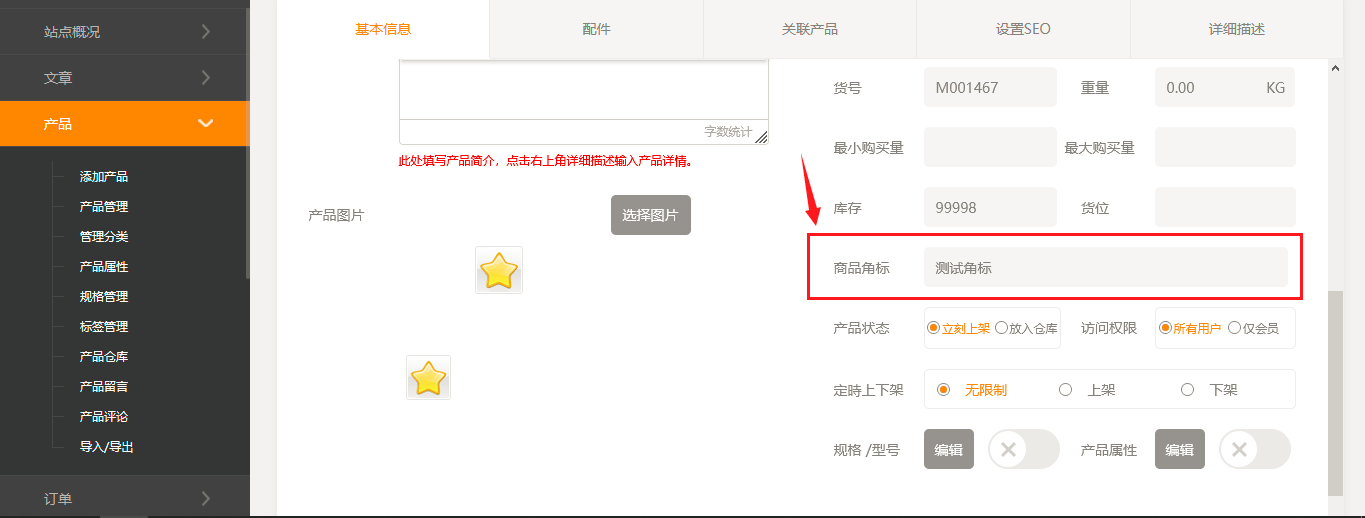 1. 在建站后台,“产品”-“产品管理”中添加或者编辑产品,新增了商品角标字段,如图所示: